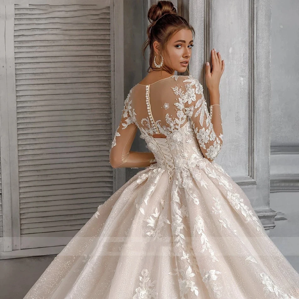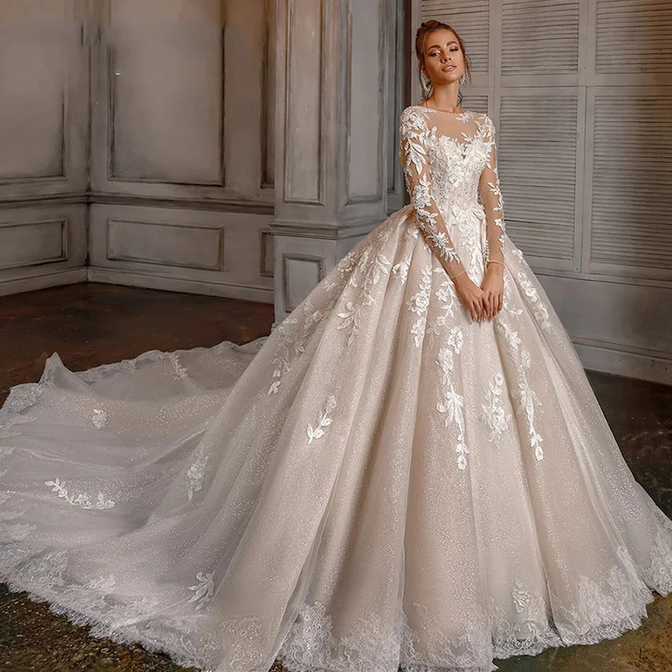 Haute Couture Elegant Beige Bride Dresses With Leaf Embroidery Long Sleeve Button-up Beaded Custom Wedding Dress