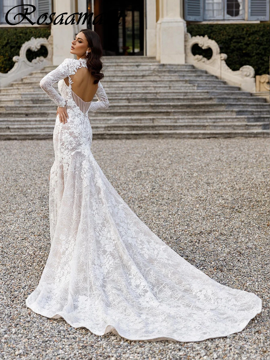 Romantic High Neck Open Back Mermaid Wedding Dresses Long Sleeve Appliques Lace High Split Bridal Gowns Robe De Mariée